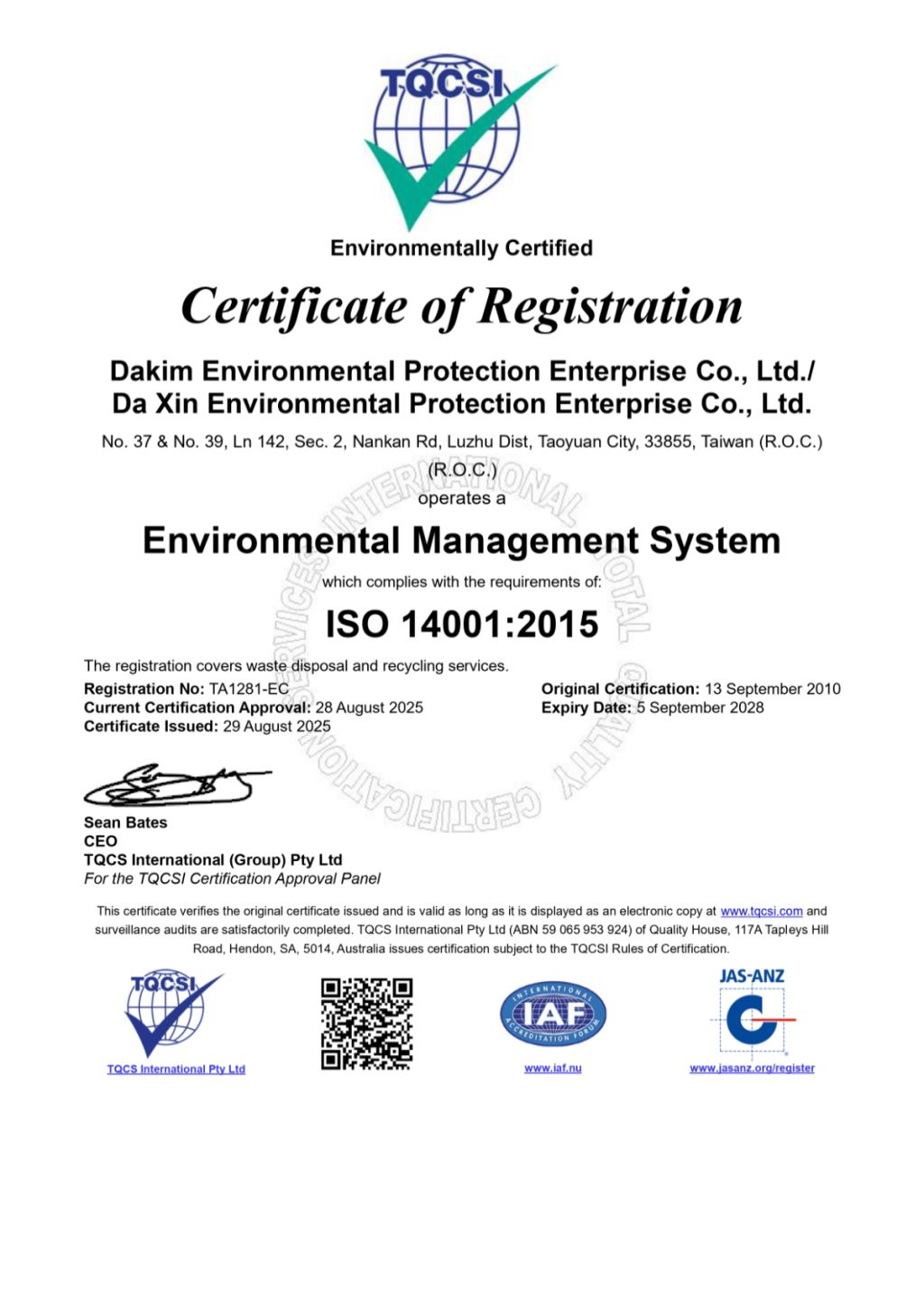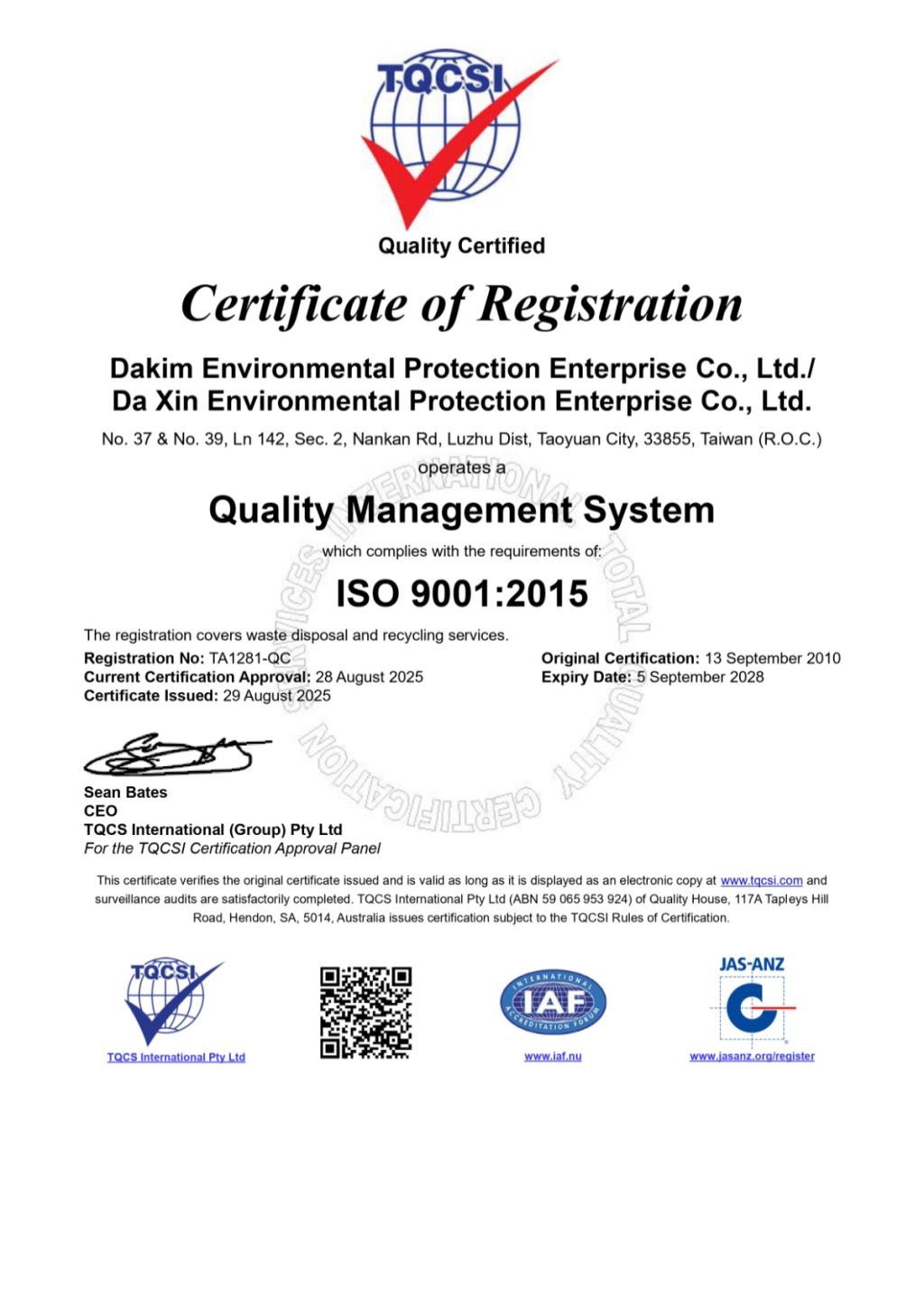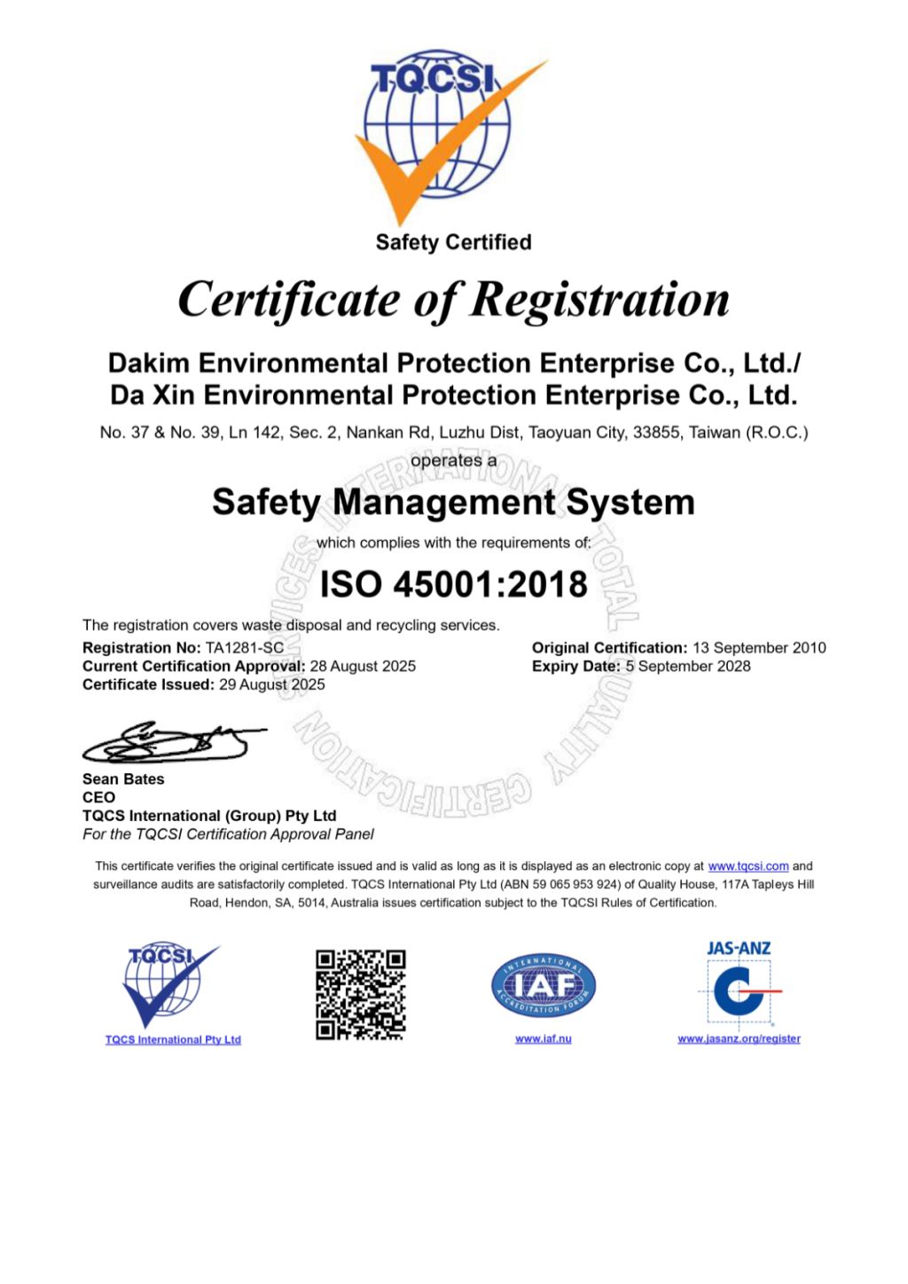 Dakim is a Class A Waste Clearance Organization certified by the Environmental Protection Bureau of Taoyuan City Government. We also operate a Class B Waste Treatment Organization. Through the seamless integration of these two core capabilities, we create a powerful synergy that identifies the most resource-efficient solutions for all types of waste. We pride ourselves on being experts in the environmental industry, and we hold our employees to the same standard of excellence. Dakim actively encourages team members to obtain professional environmental certifications; currently, over 85% of our staff hold Waste Treatment Technician Licenses, and 100% of our drivers possess all required professional operating certificates. Under our rigorous corporate governance, we have successfully achieved multiple ISO International Standard Certifications, ensuring that our management structure and service quality remain at the highest global standards.