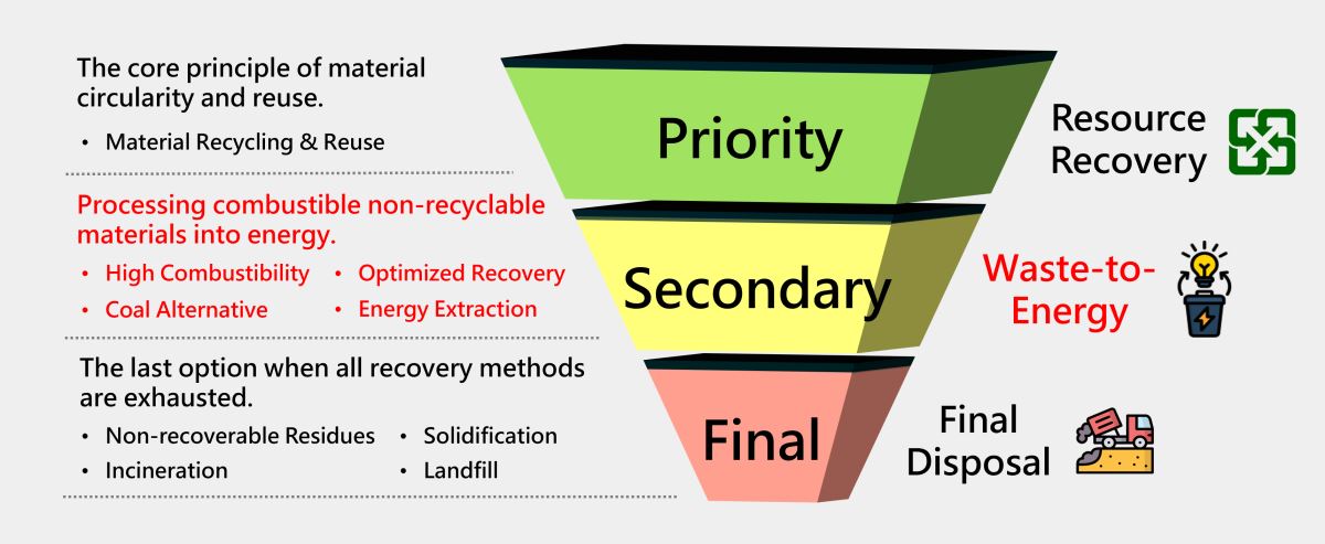 While SRF sources abroad include a diverse mix of household, commercial, and construction waste, Taiwan maintains more stringent regulatory standards. Our raw materials are limited to specific industrial wastes, such as waste plastics, rubber, paper, wood, fibers, and textiles. This strict selection ensures a high-purity material composition, resulting in SRF with stable heating values and low chlorine content, preventing environmental hazards caused by inconsistent fuel quality.